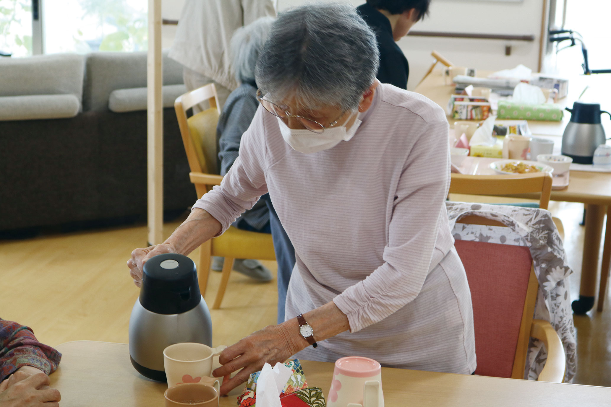 お茶を自らいれる姿、人にいれてあげる姿、自分のタイミングでトイレに行ったり、食事の準備を手伝う、食事を取りに来る、下げる、洗い物をする、掃除をしてくれたり、昼からは自分たちで料理をしたり、畑をしたり、社会参加活動として近所の公園を掃除、お店の買い物かごを拭く作業、コンビニでの清掃、商品出し作業等、施設内で販売しているアイスクリームやジュースを買って休憩して、フロアーや洗面台等の掃除をしてくれたりする姿。
