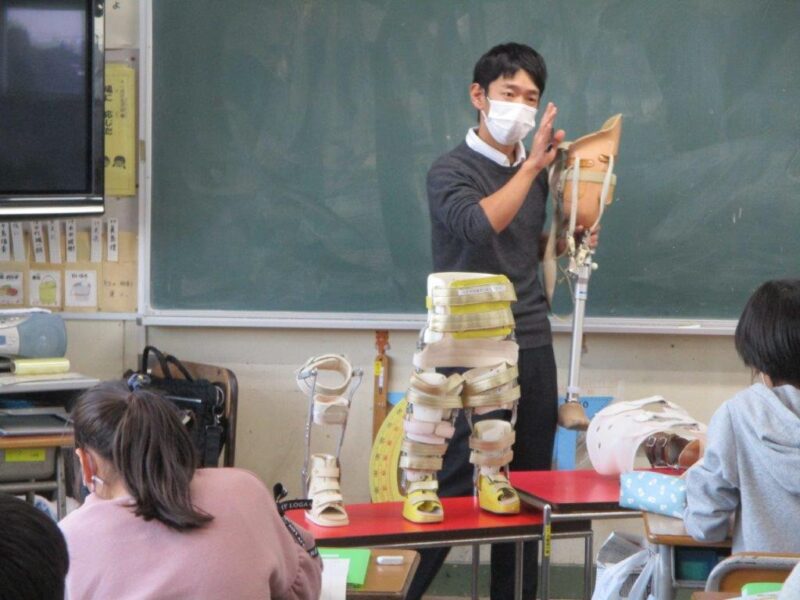 私は,地域の義肢装具士として子供たちに「義肢や装具はどのようなモノか」について講話しました。大人でも触れることが少ない義足や義手・装具を手に取り動かす子供たちは,好奇心の塊でキラキラ輝いていました。他にも模擬義足を装着して歩いてみたり,友達の足型を採ったりご要望に合わせて行います。授業を通して,義肢装具を学ぶだけでなく,相手のことを考え自分に何ができるかを考える子供たちを見て将来が明るく見えました。