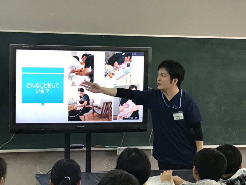医療や介護についての知識を伝え、その職業について必要な資格や勉強についてもお話ししていただきます。子供たちから質問も多く出ます。