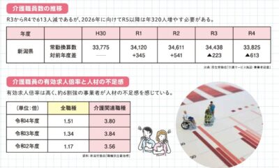 令和4年度新潟県の介護職員数・常勤換算数は、約33,800人であり、平成30年度とほぼ横ばいとなっています。一方、令和4年度の有効求人倍率では、全職種が1.51倍なのに対し、介護関連職種は3.80倍と高い状況にあります。また、約6割強の事業所において従業員が不足していると感じているとの調査結果もでています。