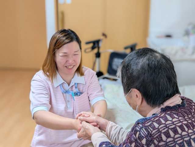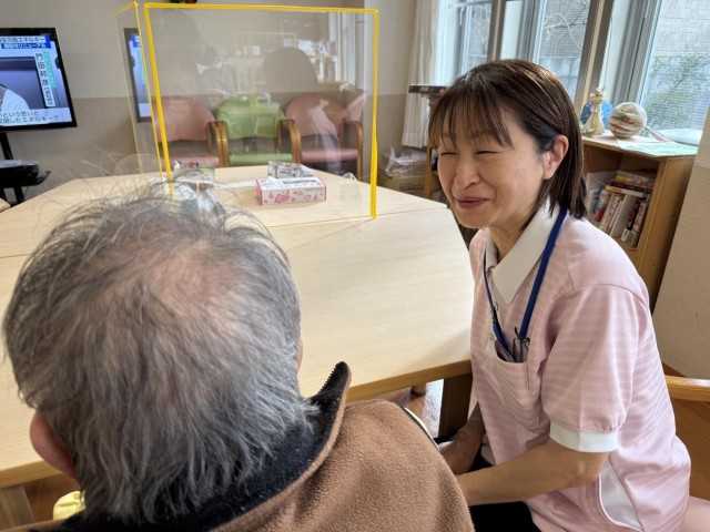 「業務の効率化などにより以前と比べて、利用者様とじっくり関われる時間がしっかりあります。 周りの職員の関わりや言葉遣いも丁寧で、自然と自分のケアも変わってきたと感じます。 “人を大切にする空気”がこの職場にはあるんです」。利用者に1対1でじっくり関わることができることで、一人ひとりに向き合った個別ケアが提供できています。