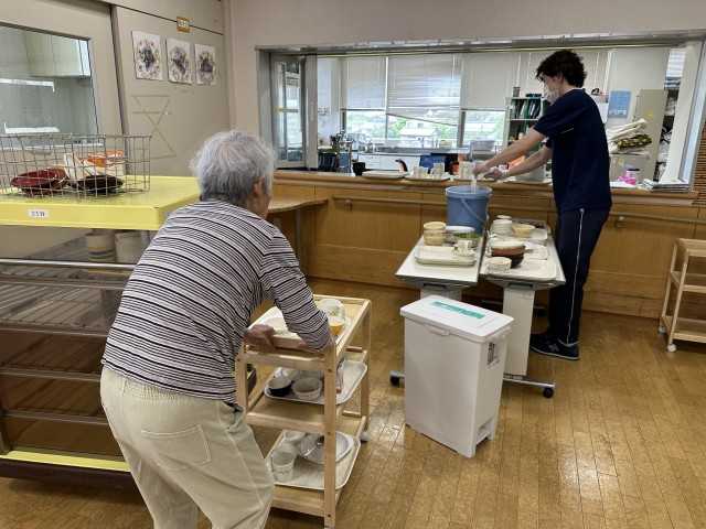まさに選択と自由のある施設づくりを実践されています。装飾とかを工夫し、利用者の動線も考慮しての空間活用を整理し、居場所や休憩室を設けて心地よい場所が多くありました。テラスの環境整備では庭園が完成し畑なども頑張っていてこれから楽しみな面も見られました。食事時には、食後に利用者自ら下膳する様子や清掃などをする姿も垣間見られ、これも環境を丁寧に整えてきた賜物ですね。