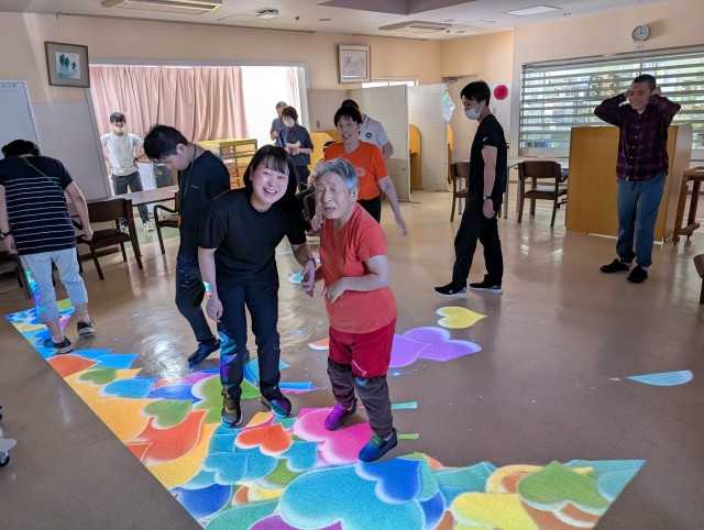 県内で唯一インタラクティブ投影型支援機器「オミ・ビスタ」を導入。床や机に映像を投影し、触れる・動かす体験を通じて、楽しみながら感覚刺激や運動・認知のサポートが可能です。取材日に実際に体験しましたが、ただ体を動かすだけでなく、映像を見て動かすことでの知能的にもアプローチされていると感じました。利用者の笑顔と意欲を引き出す、新しい支援のカタチを実現しています。