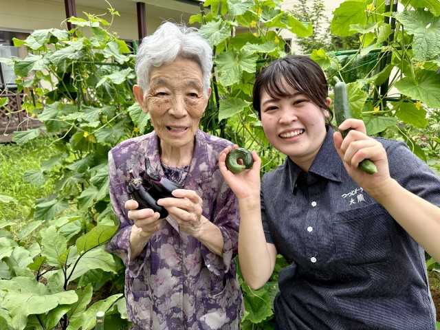 機能訓練の実施に当たっては、在宅生活の継続を意識し、一人ひとりの状態に応じた計画が策定されていました。施設内の廊下は広く、ぐるりと回れるようになっており、訓練が単調にならないように工夫がされていました。また、畑では、トマトやきゅうり、なすなどの菜園があり、収穫しやすいように利用者の立つ位置や姿勢に配慮し「おいしそうな色ですね」と職員が声かけしながら行っていました。更には、長岡花火を見学や市内の団子屋で団子つくりなど、利用者の意欲を引きだす様々な取り組みが行われている点が素晴らしいです。